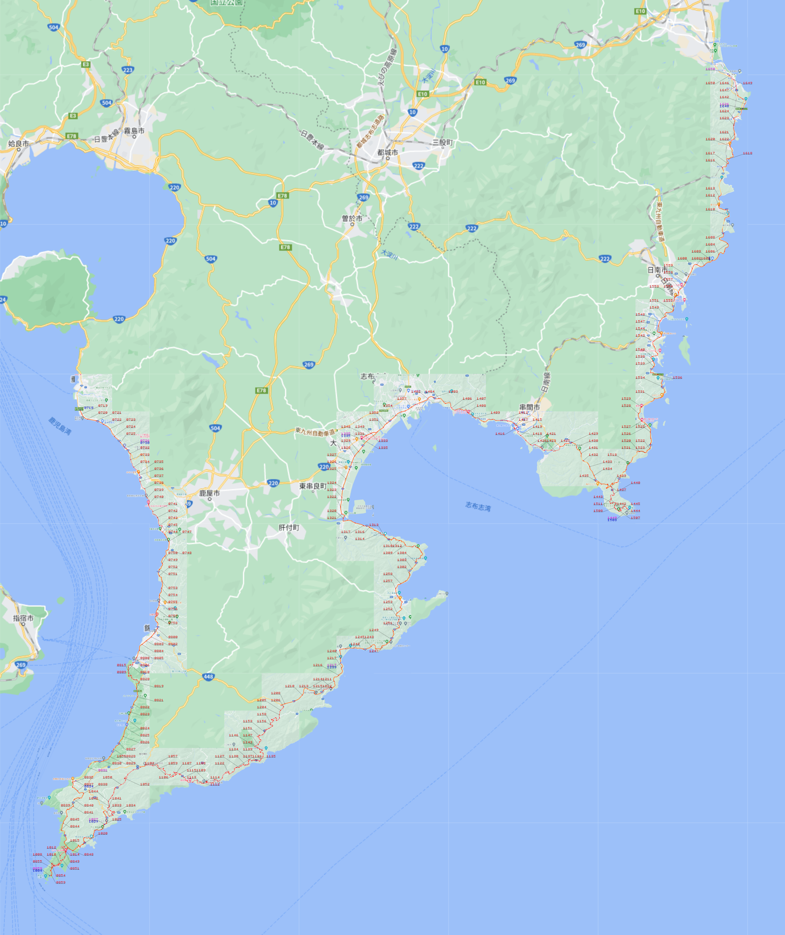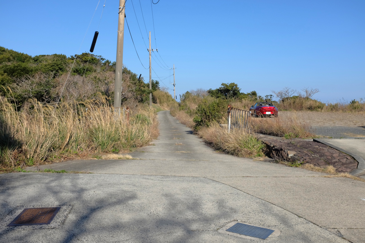 今日はとんでもない距離を走る予定なので、そそくさと宿に戻り、7時過ぎには出発。トンネルを通りたかったので温泉街を一周してから西へ向かう。そして走りに走って、一気に野間岬まで。しかし、こういう岬もあるんだな。岬といえば大概、堤防まで遊歩道があるものかと思ったら、野間岬はまったく観光地化されていない。車がギリギリ走れる道が途中まであるだけだ。どうも、以前は風力発電の風車がたくさん設置してあったらしいが、数年前に撤去されてしまったようだ。もう少し奥まで行けそうだったが、ヤバそうなので広場で引き返す。というか、この広場は5番目の風車があったところみたいだ。