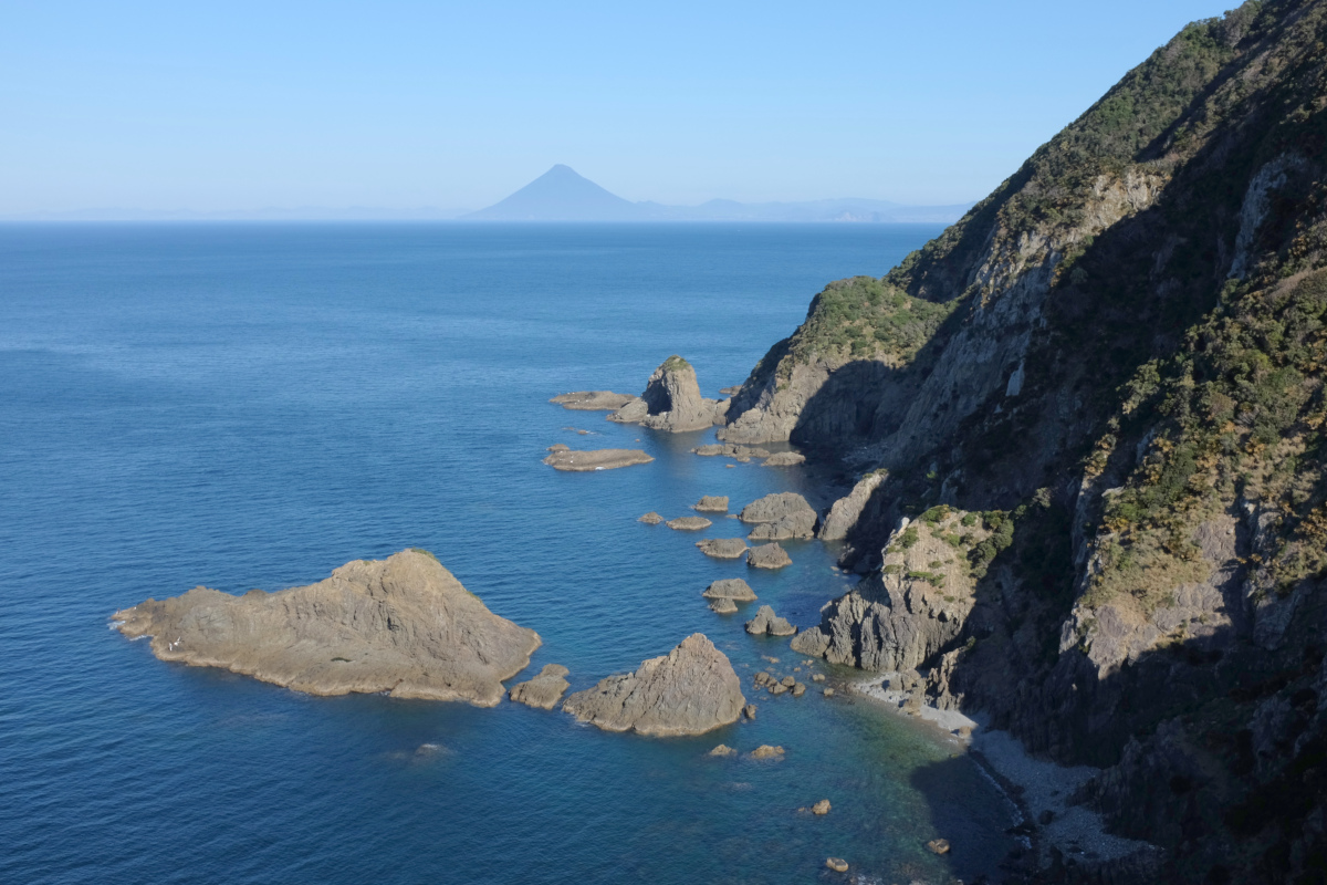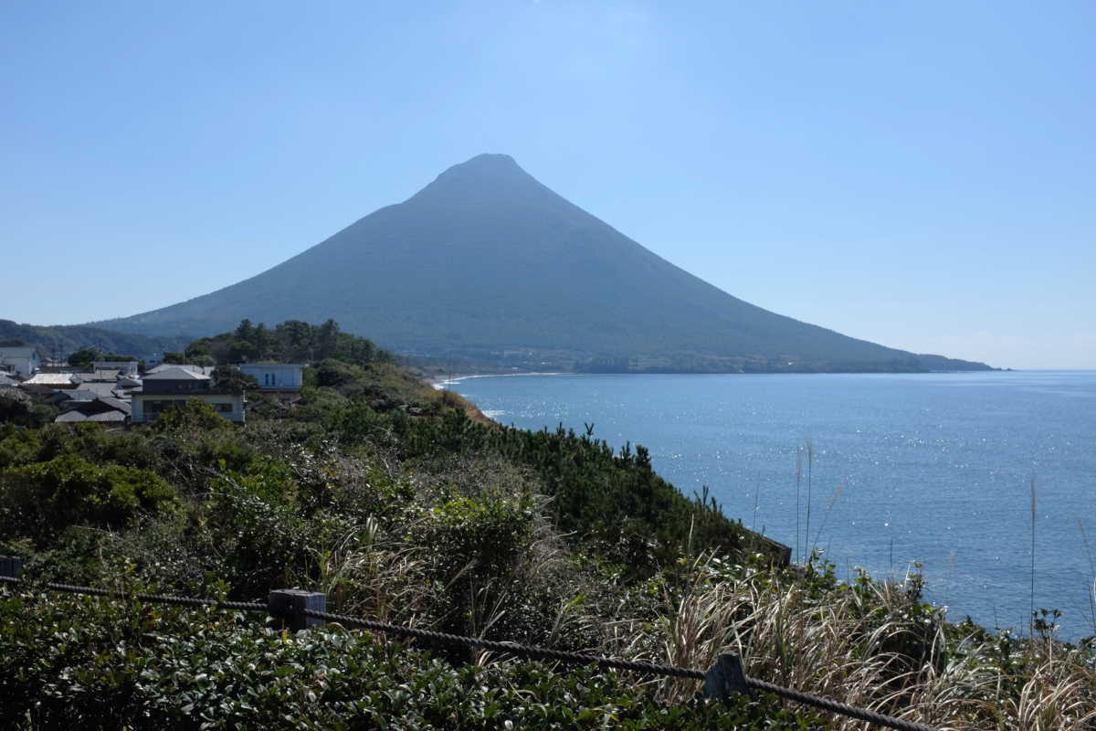 駐車場には観光案内所という名の売店があった。まずは、だいだいソーダというクラフトファンタオレンジを流し込む。その先はソコソコの距離を徒歩で進む必要がある。遠くにある、右の矢印が展望台、左の矢印が灯台守の官舎跡地だ。開聞岳も見える。展望台へ向かい、さらに到達できる最南端である官舎跡地まで行ったが、平日で誰もいない。途中、足を踏み外して転落したら、行方不明になって終われるな。