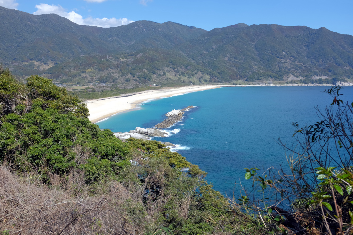 しばらく快走路を行くが、予想通りコンビニ等は見当たらず。昼を過ぎたのにロクな手持ちの食料はないが、岸良展望所という美しい砂浜の絶景を見下ろせる場所で昼飯にすることにした。長らく持ち歩いていた、あか巻と、さっき買った、雄川の月と、家から持ってきた魚肉ソーセージという寂しい食事だが、好天の下の絶景がスパイスとなって、強く印象に残った昼飯であった。