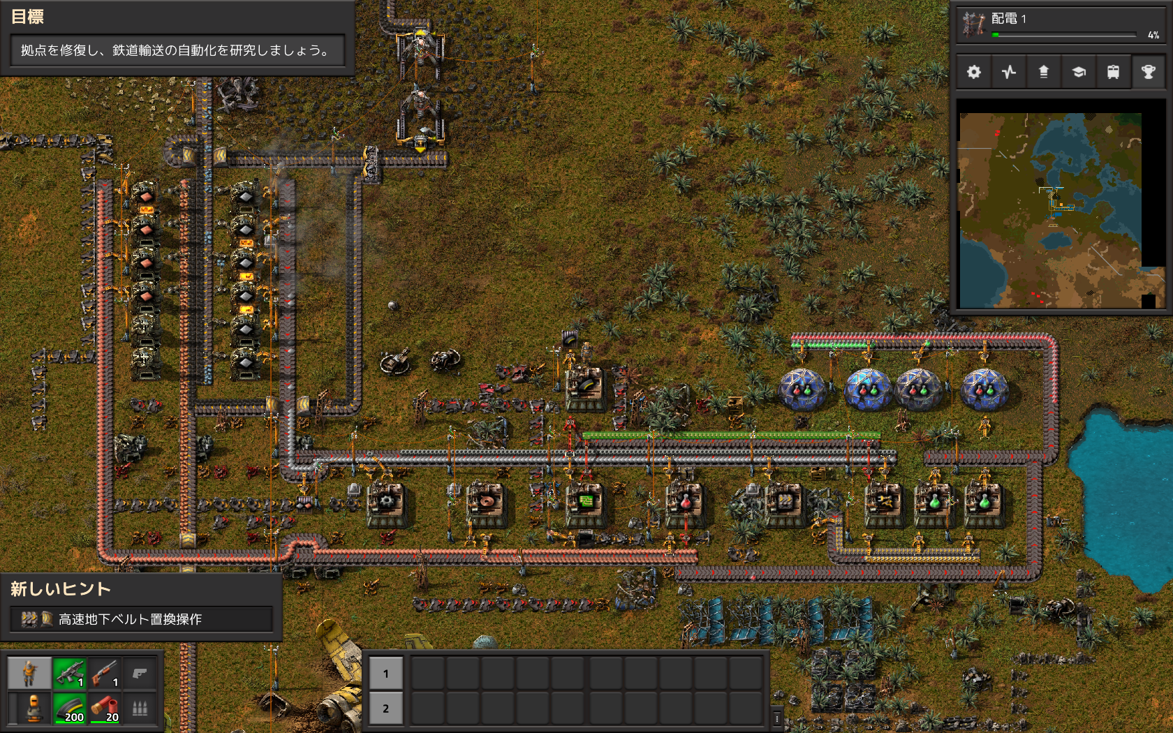 製品版を買ってしまったところで、完全な初期状態から始める。久々の手作業での採掘がダルいが、最初から赤色の自動化サイエンスパック、緑色の物流サイエンスパックの量産を想定し、前回作ったラインを更に改善しつつ再構築。
