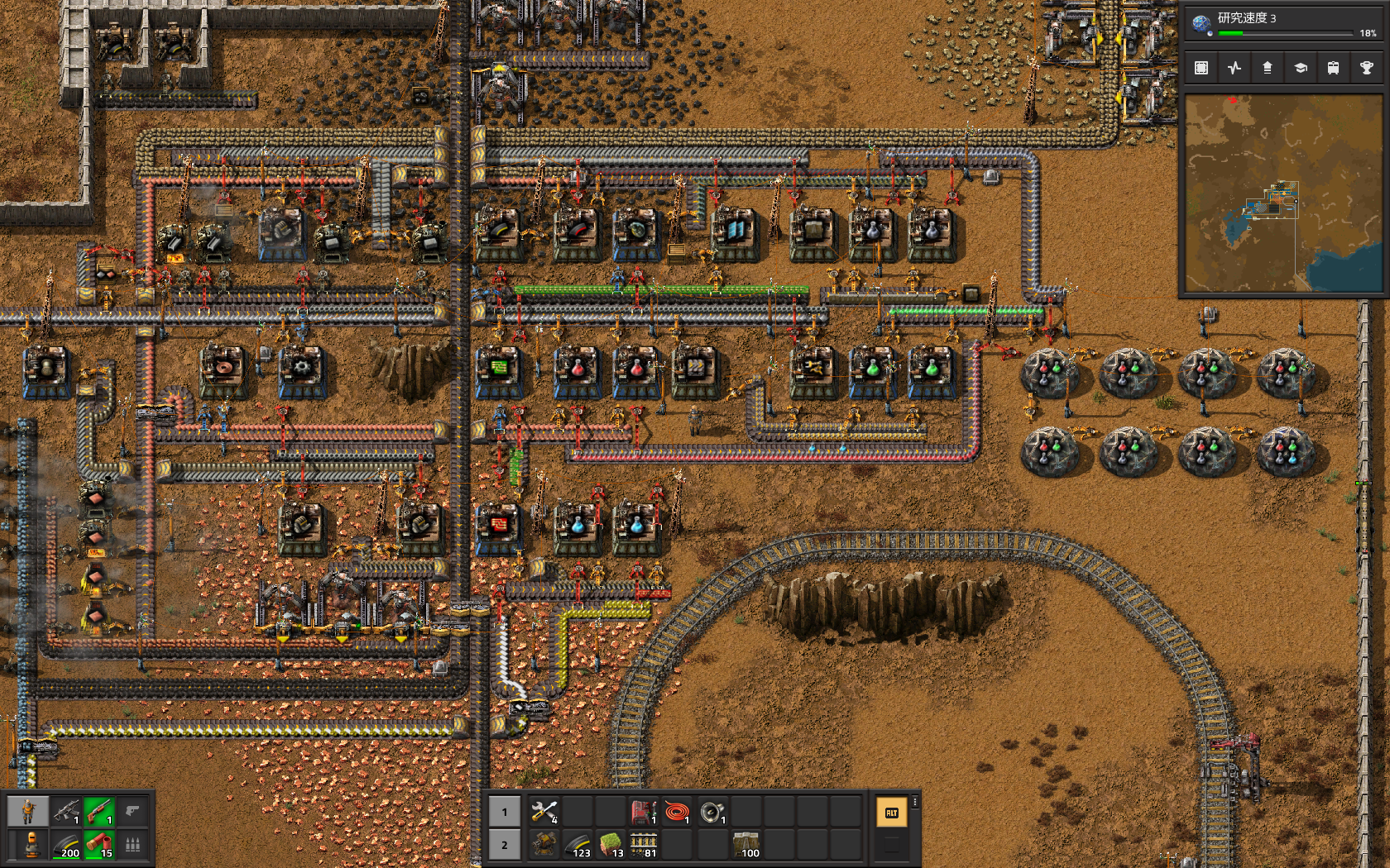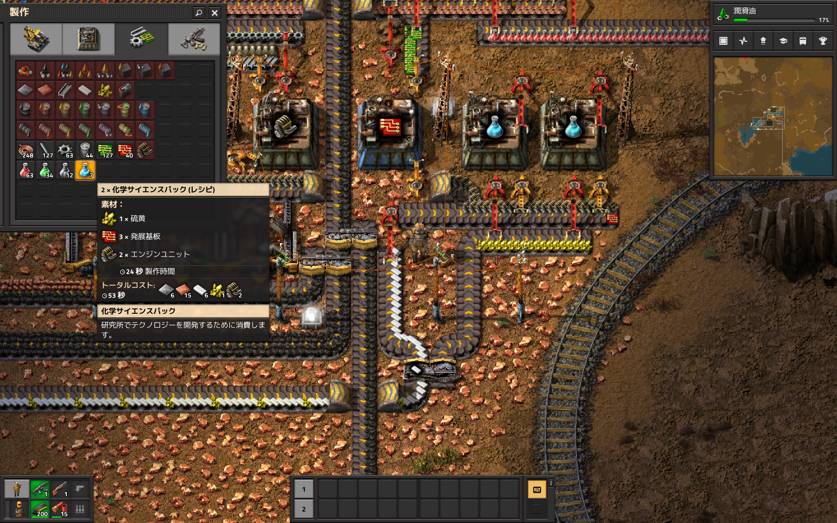 Factorioを始めて、しばらくして気づいたのが「ベルトに複数のアイテムを混在させて運ぶと詰まってしまう」ということだ。それを防ぐには「ベルトに複数のアイテムを混在させない」ことだ。そうすれば「消費が遅く、生産能力が過剰」か「消費が早く、生産能力が不足」のどちらかにはなるものの、詰まってしまうことはなくなり、人手を介入する必要はなくなる。ここ数日はそれを目指して、赤色、緑色、灰色のサイエンスパックの量産ラインを完成させてきた。