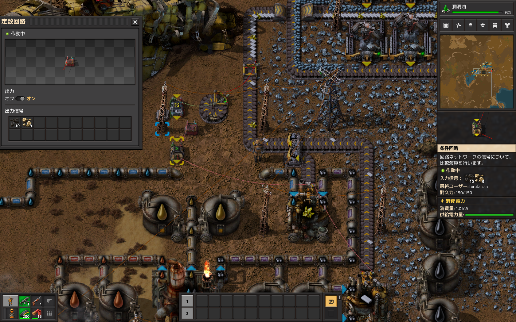 やり方を思いついては、試してうまく動作せず、の繰り返し。数十時間を費やしても実現できない。回路も組めるプログラマとして、プライドはズタズタだ。どうやら、変数がなかったり、論理演算にクセがあったり、コンデンサのようなタイマがなかったりと、Factorioの回路を、既存の概念の範疇で捉えようとすることが誤りのように思えてきた。