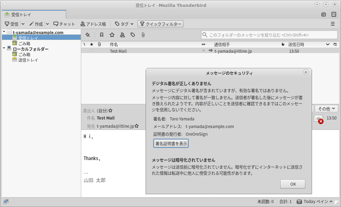 署名付きのメールを受信すると、封筒マークに赤い×が付いたアイコンが現れ、それをクリックすると「デジタル署名が正しくありません」「メッセージは暗号化されていません」と出る。だが、どちらも期待通りだ。前者は、オレオレ認証局による署名だから、信頼されていないという意味だし、後者は、そもそも暗号化を実装していないし、実装するつもりもないから。