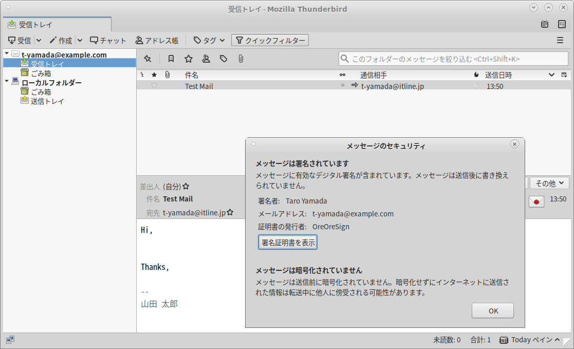 オレオレ認証局の証明書をThunderbirdに追加するとこうなる。封筒マークから赤い×が消え「メッセージは署名されています」となる。これが正しい状態だ。認める認証局が署名した相手からのメールで、本文も改ざんされていないことが保証された状態。