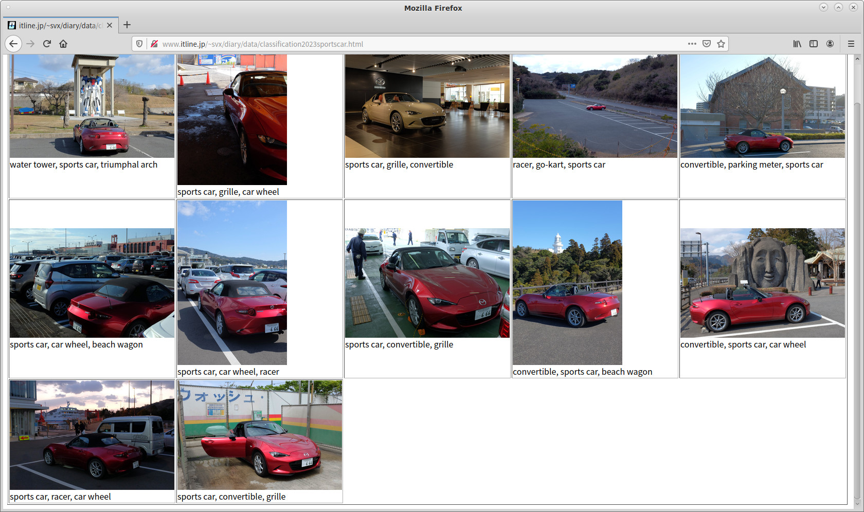 「sports car」で絞り込まず、2023年の全ての写真を判別した結果がこれである。「Inception v3」は海外で訓練されたモデルであり、識別結果は1001の英名詞に限られるので、やや不自然な識別結果も含まれるが、それでも高水準の識別結果であると思える。例えば「ごはん」は「mashed potato」と識別されているが、見た目も位置づけ(?) も大きく間違ってはいない。