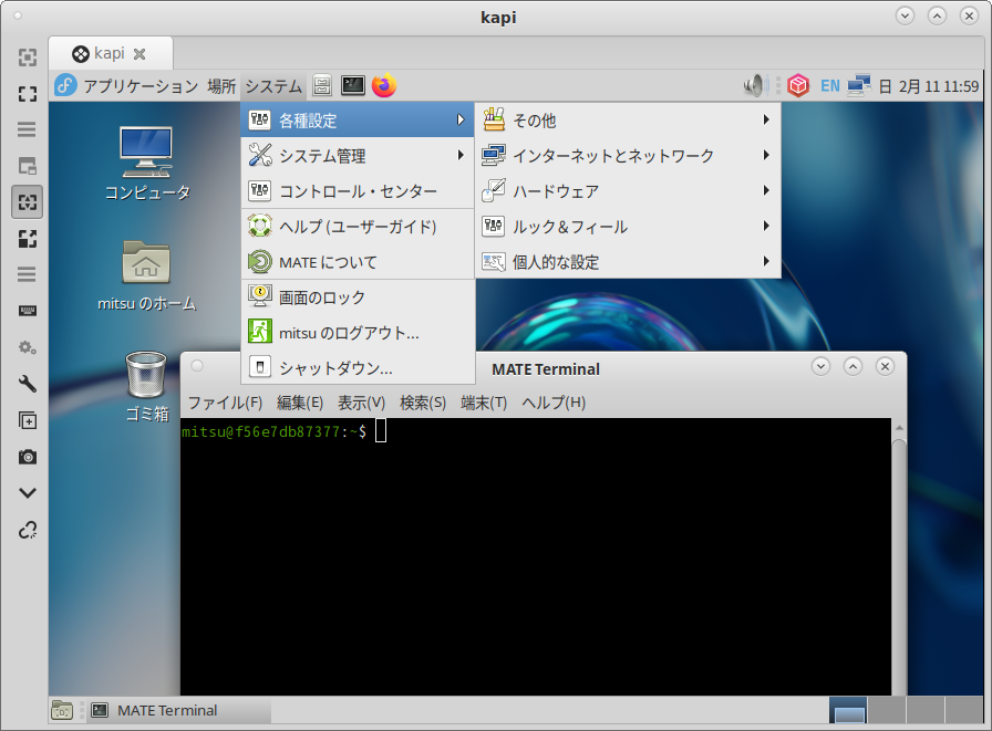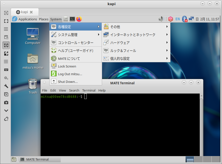 前回「最後、言語とタイムゾーンの設定の問題」をクリアしたかように書いたが、よく見れば、左上のメニューも、ターミナルのメニューも、「Applications」や「File」などの表記のままであり正しく日本語化できてはいない。別に実用上は問題ないのだけれど、ロケールを正しく設定しているにもかかわらず、なんでなの? という気持ちは残る。