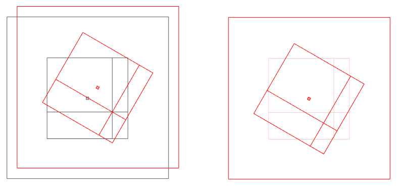 キャラクタの回転機能は、特定の「正方形のパターン」を元に、回転後の「正方形のパターン」を得るものだ。当初、バックグラウンドを表示するなら、それを敷き詰めればいいと思い、アルゴリズムを考えたのだが、「パターンの特定位置を中心に、回転後のパターンの表示位置」を求めようと思うと、どうにもパターン中心までのベクトルを求める必要が生じて、アークタンジェントを計算することが避けられそうにない。