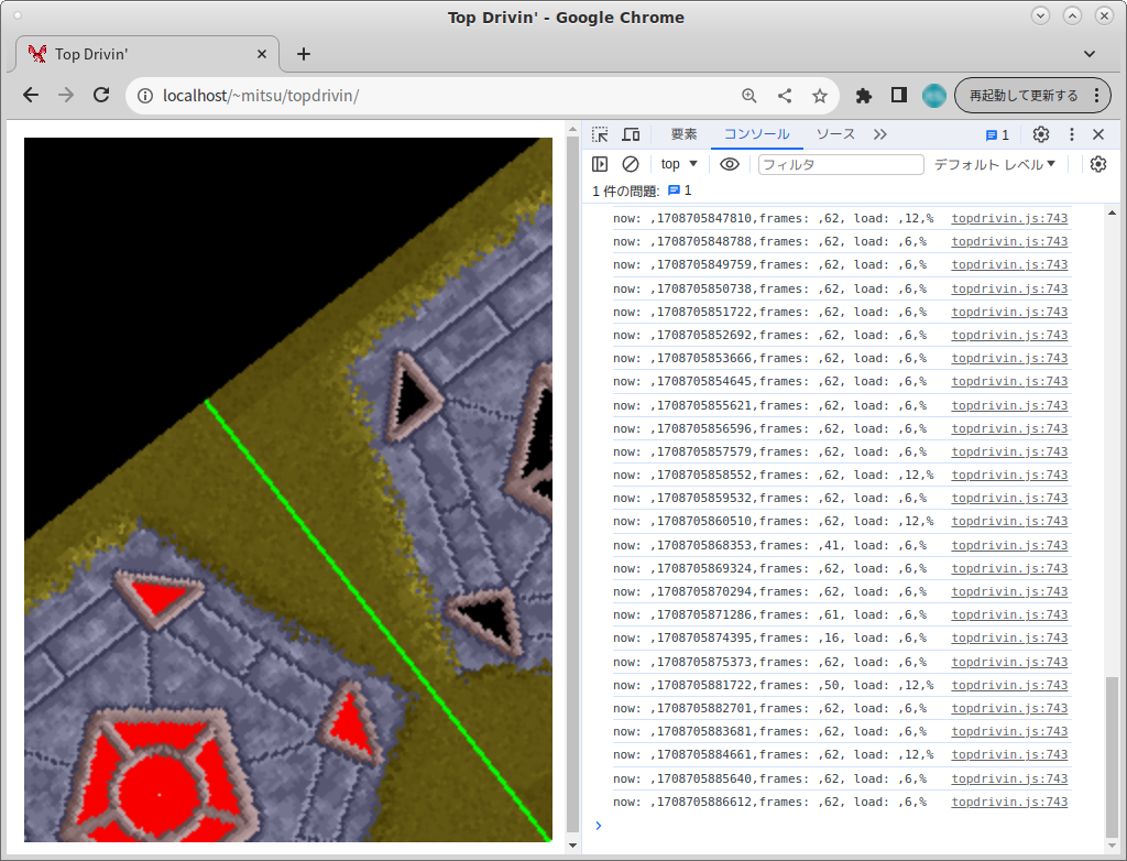 BGの回転処理ではパターンのキャッシュは行わないので、都度の生成だが、手元の環境だと、240x320、60FPSでのCPU使用率は、Firefoxで20%、Chromeで6%程度。ちなみに240x320というサイズは、スーパーフォーミュラへのオマージュであるが、その前提であれば処理速度にはまだ十分に余裕があるといえよう。SIMD命令は、まぁ気が向いたら、で。次は、地球上の任意の場所を走り回れるようにするのがマイルストーンかな。