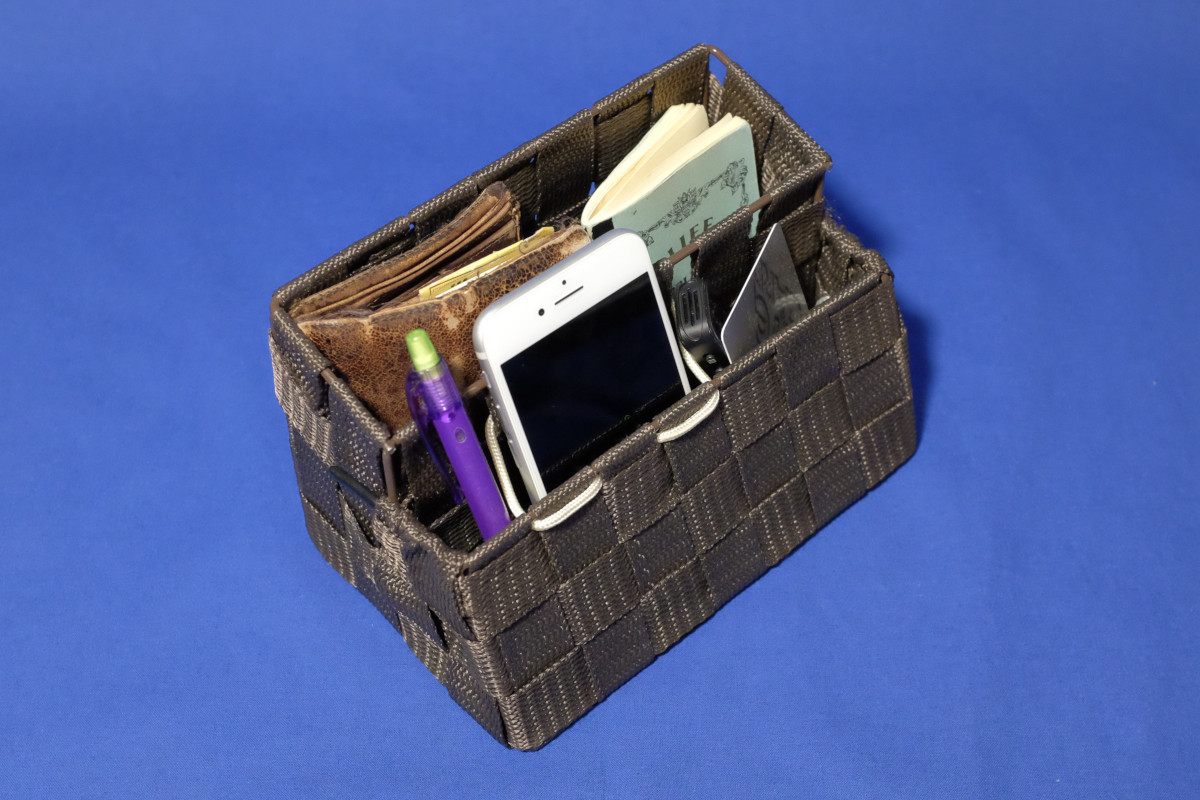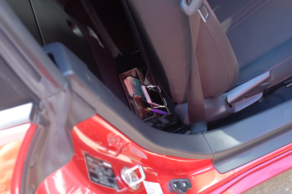 元はダイソーの「抗菌PP収納リモコンBOX」というもの。車内の灼熱にも耐えられそうな素材だし、この厚みならナントカ入るだろう、と思って買ったら私は足が長すぎるので(おっと!?)座席の後の余裕が少なくギリ入らなかった。なので、フレームの一部を金ノコで切断し、斜めに曲げて少し幅を詰め、ついでにスマホが転がらないようにヒモで枠を追加する加工を施してある。