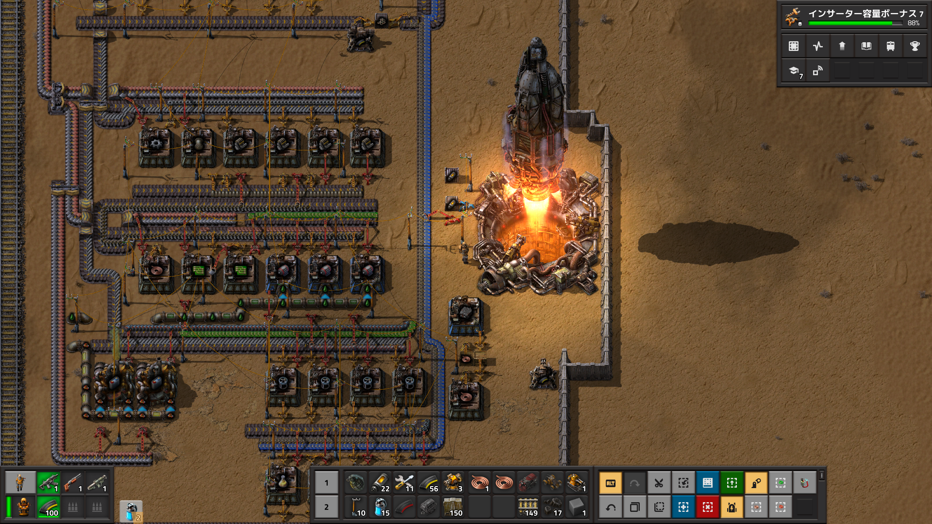 早い段階で「軽量化素材」「ロケット燃料」「制御基板(青)」を量産しておいたのだが、ロケットサイロを作ったあとで、散々「ロケット制御装置」の作り方を探し回ってしまった。廃止になったのなら言ってくれよ……「レッド/グリーンケーブル」もだよ。バグかと思ったわ。