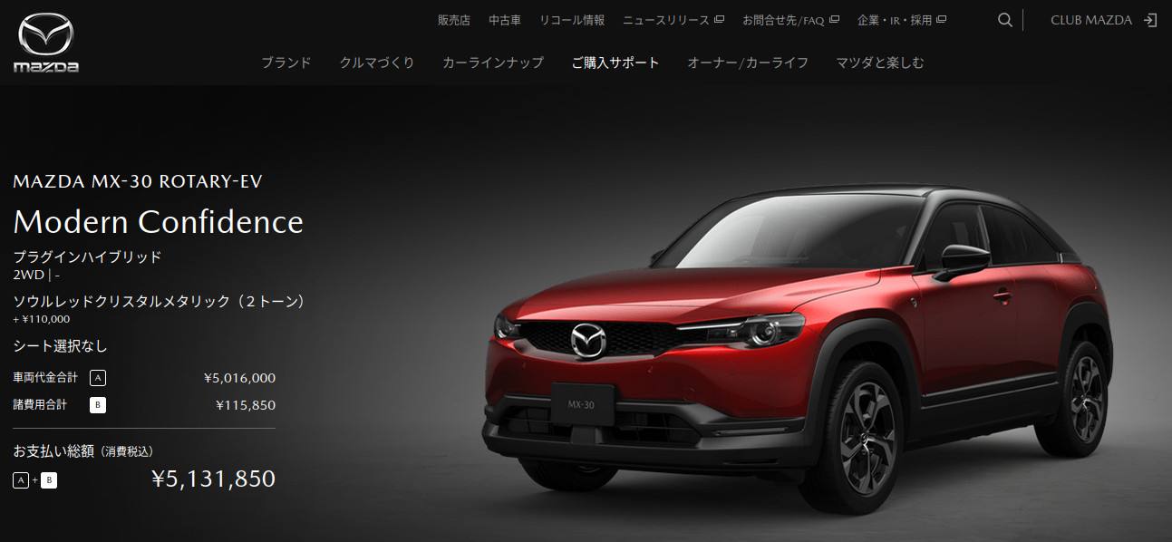 その話をカミさんにしたら、そんなの借りときゃいいのに、という反応。いや、そりゃそうだけど、2km弱を乗ったところで何になるってんだ、などといいつつ、なぜかRotary-EVの素晴らしさについて語りだしてしまうオレw。ほとんど乗らないワシらにはオーバースペックすぎるんだって、なんていいながら、サイトで見積もりまでしてしまう。天井が黒くって、ロードスターとお揃いじゃん。並べたらいい感じじゃない? ……って、そらそうだけど、ホラ、500万だってよ。500万ってさ、1年を働いてようやく余るかっていう金額だよ。MX-30のために1年働くって思ったら……いや、そういうのも意外と悪くないんじゃないかw。オレ、チョロいなぁ……。