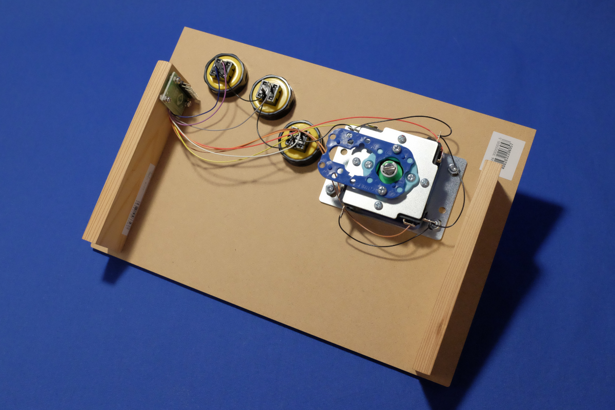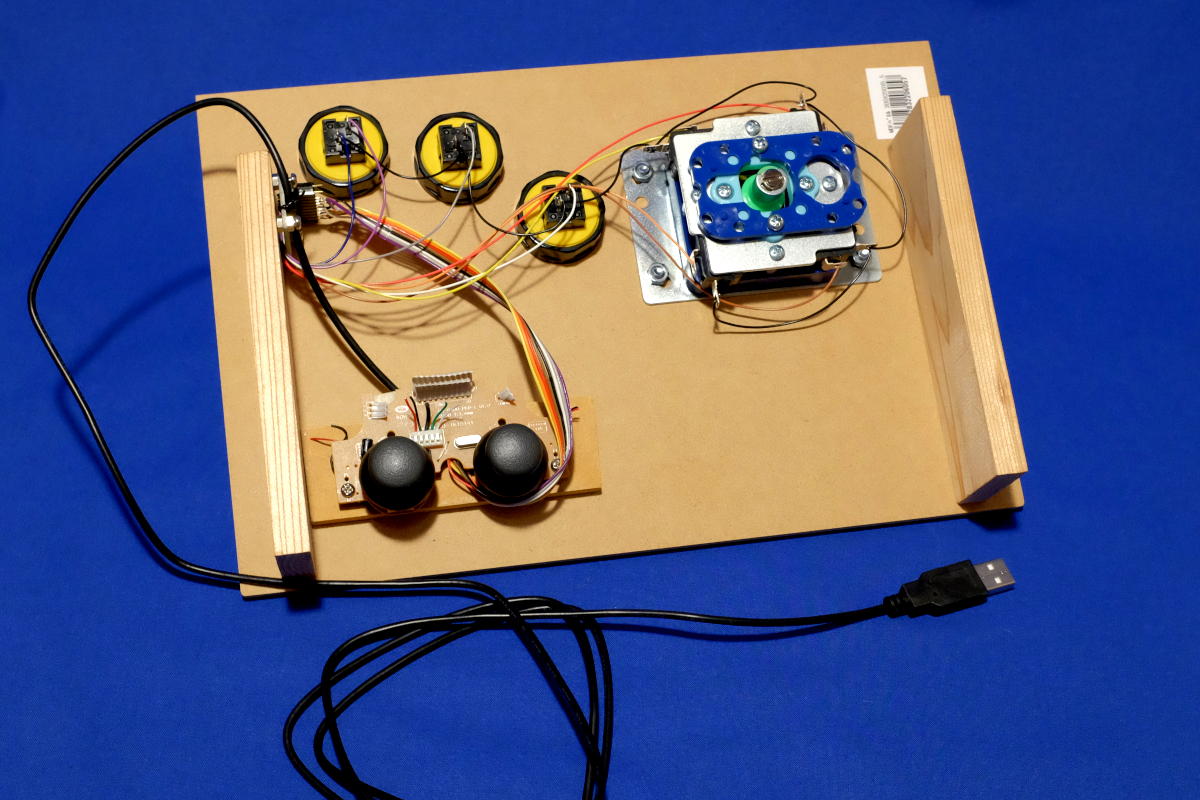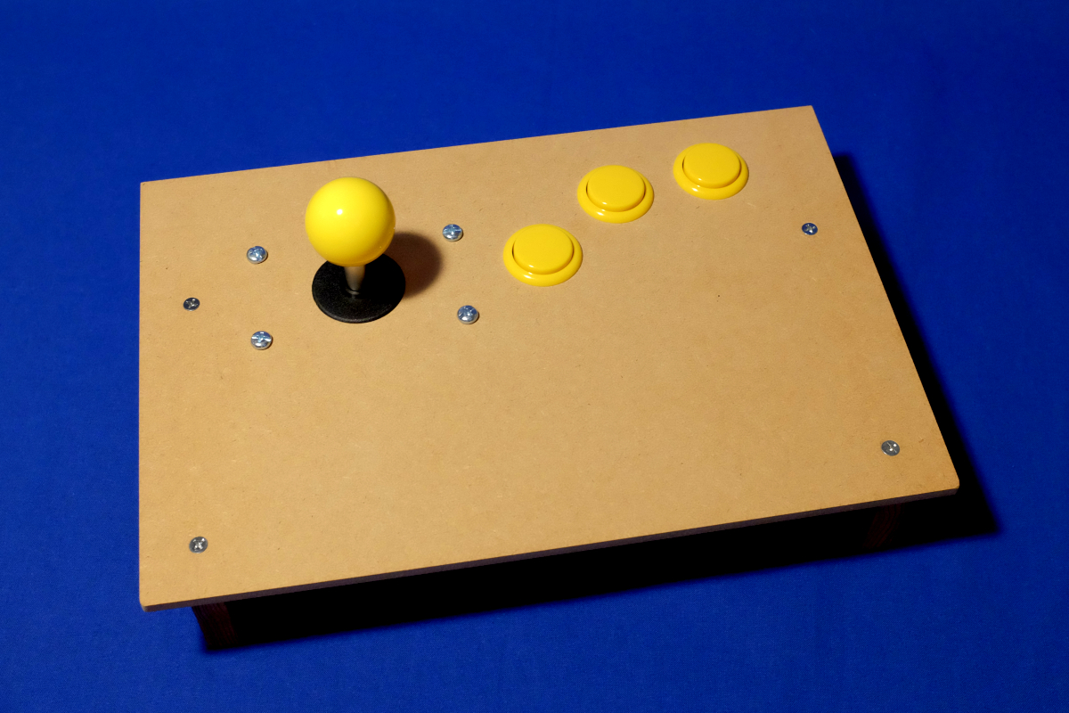 手頃なサイズでフタ付きの木箱が欲しかったのだが、そんなに都合の良いものはなかった。しかたなく、手頃なサイズ、300x200のMDFパネルを天板にすることにし、足として端材をくっつけることにした。端材の幅は45。ジョイスティックのメカ部の格納には40チョイの高さが必要なので45はちょうどいい。178円と58円。仮組み用でも構わない値段だ。