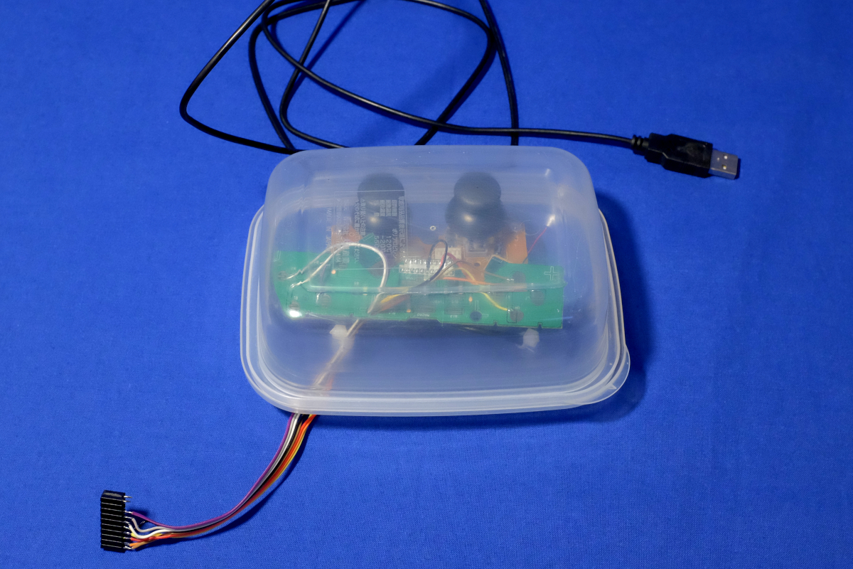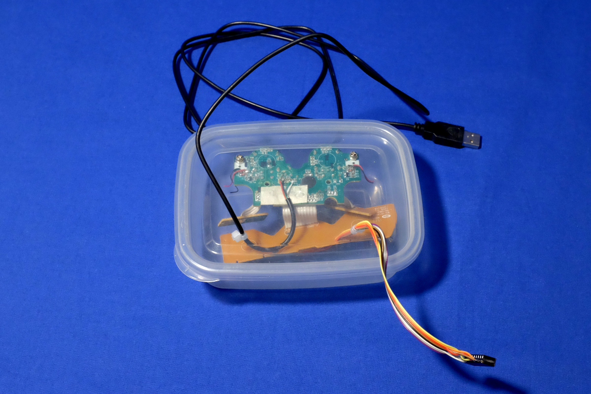バラすと基板は2枚。面倒なことに、乗っ取りたい十字とトリガの接点は、メイン基板じゃない方にある。面倒くさいので、適当なタッパーの中に放り込んでUSBの配線をやり直しつつ、グラウンドを探し、十字と3つのトリガ、合わせて8本の線を引き出す。しかし、またもやパターン中には、各接点の途中にハンダを乗せられるパッドがある。乗っ取ってくれといわんばかり。なんなの、これ? 法律で決まっているの?