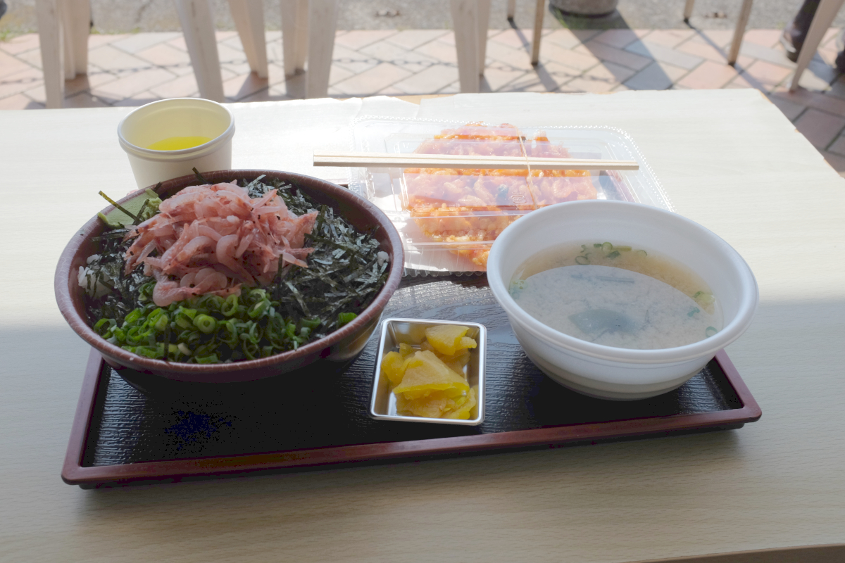 ついでに、由比は桜えびが名物ということで、桜えび丼が食べられるという由比漁港を目指すことにした。歩いて峠を超え、由比の駅を通り過ぎ、漁港へ。それほど厳密に時間調整したわけではないが、開店の30分ほど前に着いた。もう何人か並んでいる。それほどのものなのか。