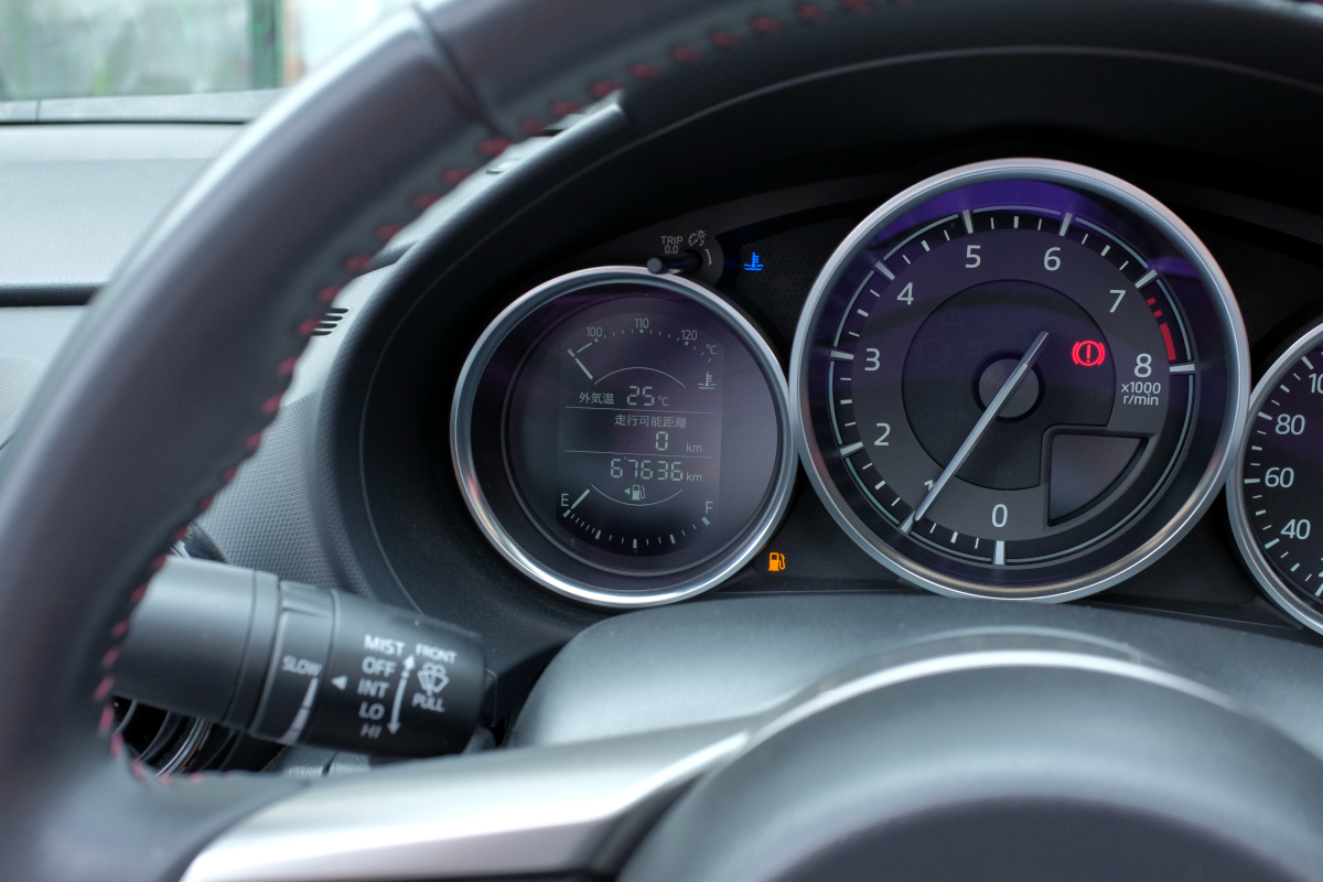 NDロードスターの整備書を見ると「燃料残量が約9リットル(フューエル・ゲージが2指針表示)のときに、燃料残量警告灯を点灯します」という記述がある。経験上、フューエル・ゲージのゼロ指針表示と、走行可能距離の0km表示は、ほぼ同時。なので、燃料残量警告灯が点灯するのは、そのタイミングよりだいぶ前だ。改めて整備書を見たら「走行可能距離は、燃料残量が6リットルになると0kmを表示」という記述も見つけた。