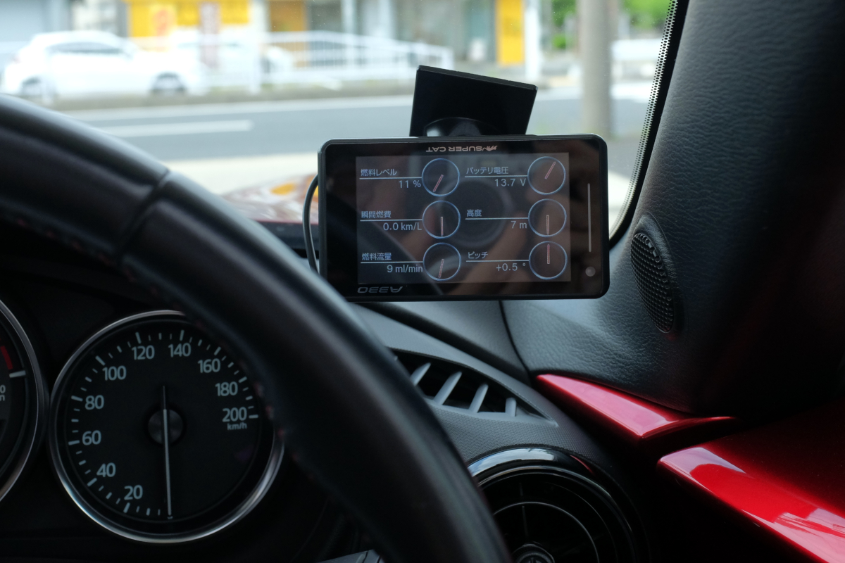 さらにもうひとつ。自分が取り付けているレーダーには、OBD2経由でCAN通信を読む機能があり、それでも燃料残量を知ることができるのだが、こっちは燃料タンク内のフロートが伝えてくる角度情報そのままのようだ。というのも、車の姿勢(主にピッチ)で上下数%をフラフラするからである。