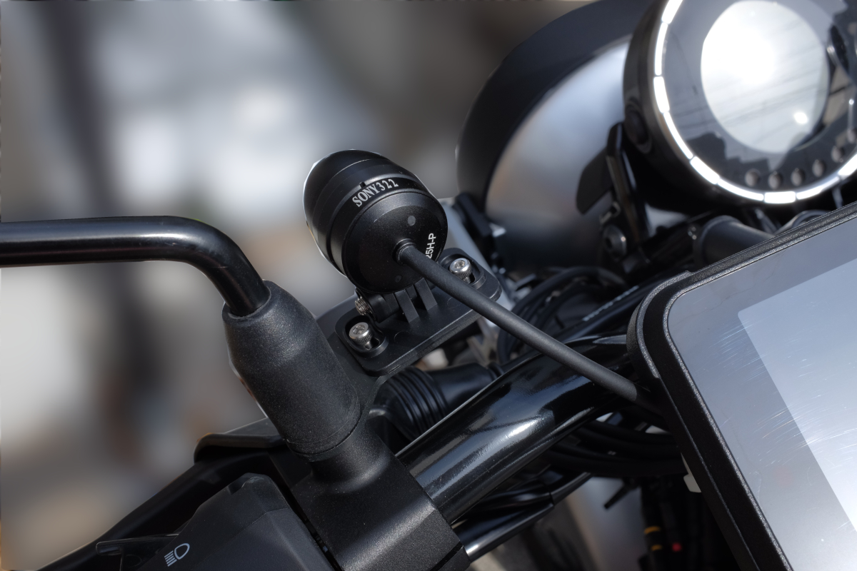 そんなもん適当な金具でエエやんか、と思いつつも、ミラーに共締めするタイプのカメラステーを買ってみた。目立つ場所だしあまりブサイクなのもヤだからね。