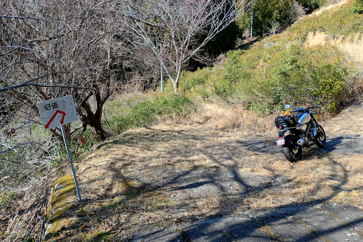 半分くらい行くといきなり開けて北条峠展望台という場所、というよりコーナのひとつに到着。ちょっと景色を眺めていると……「旧道」という怪しげな表示を発見。え、この急坂を降りるの? バイクなら降りられそうだ。やっぱりバイクだと攻めてしまう傾向だな。