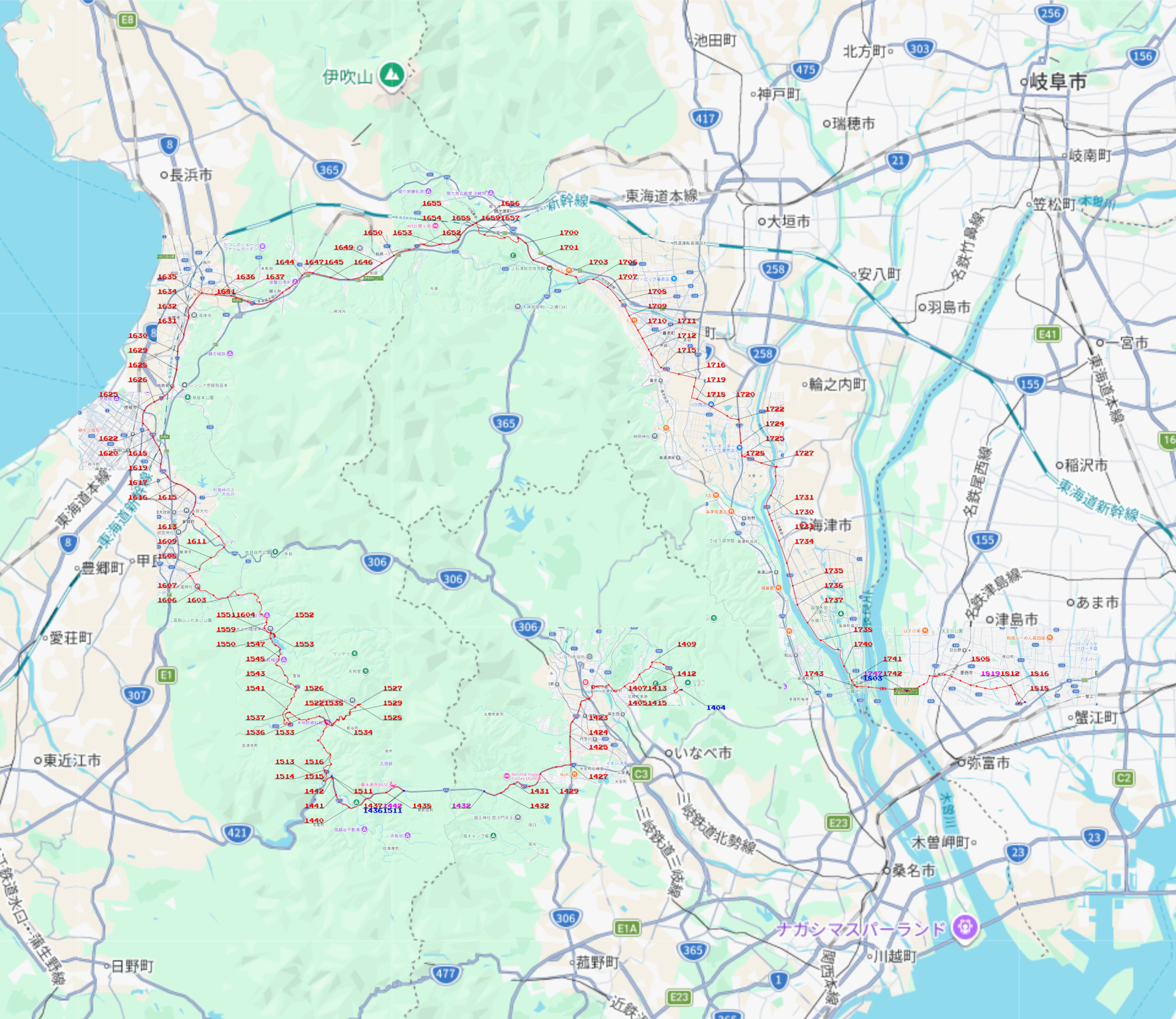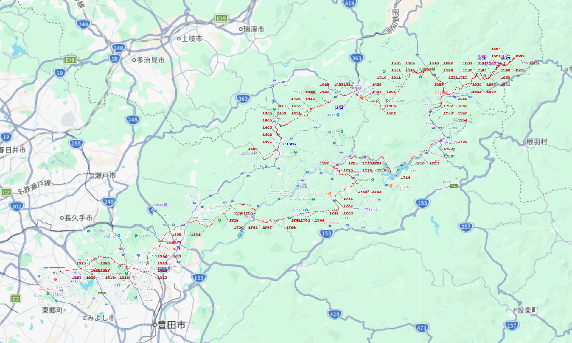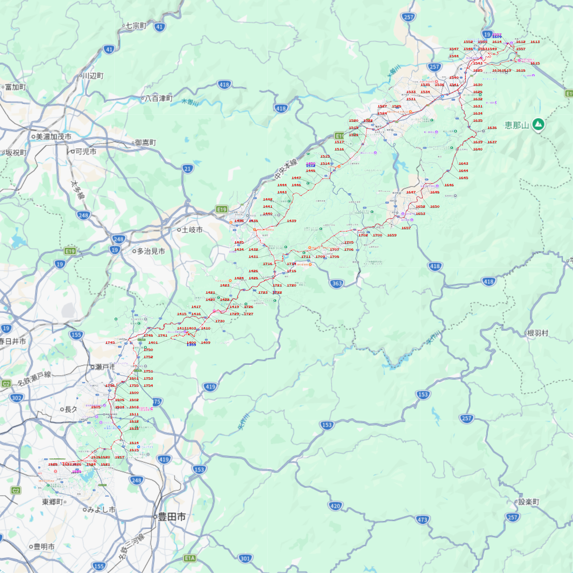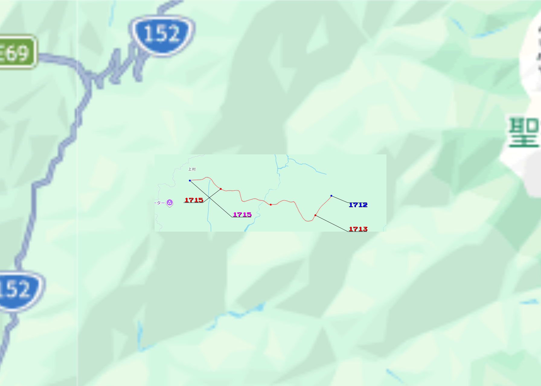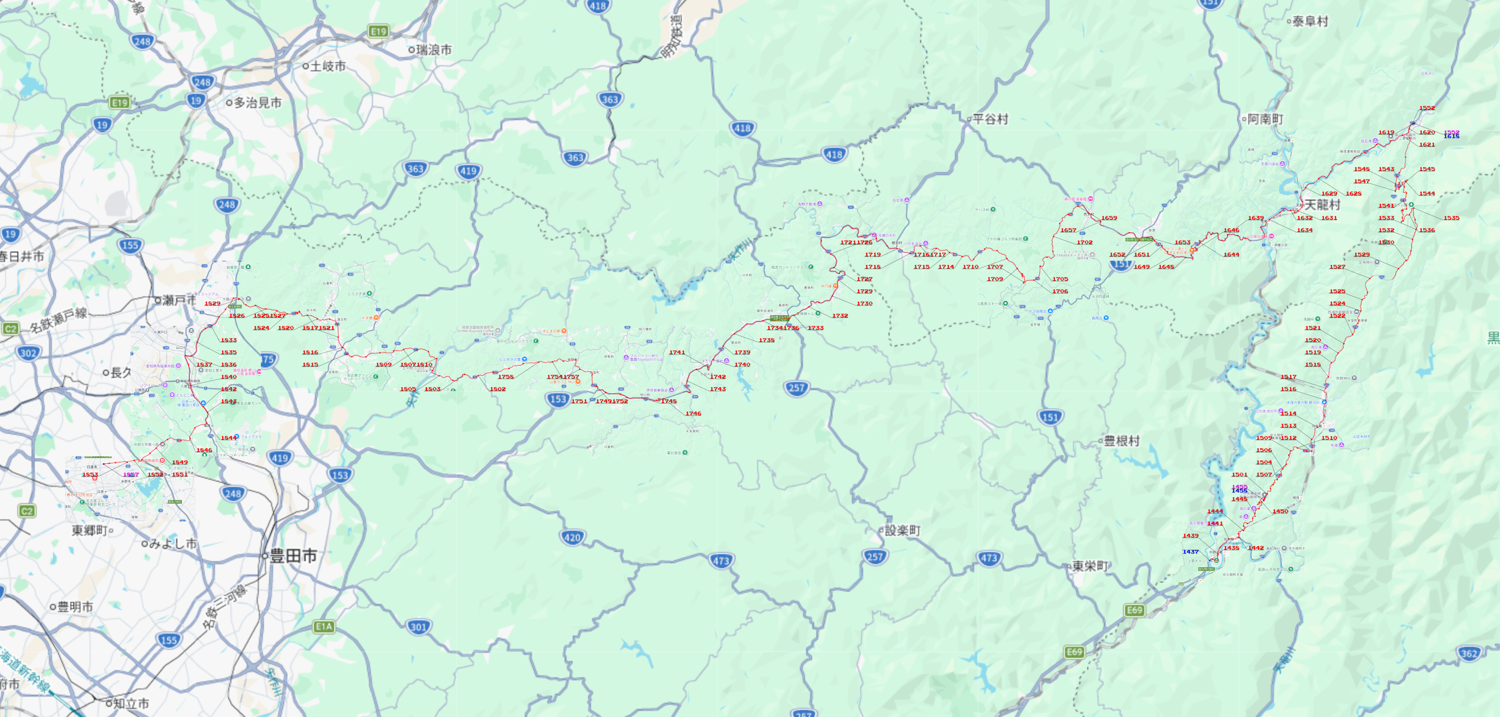 ちなみに、作図の副産物として、以下のような出力も得られる。これは、先週末のツーリング経路の作画に対応するものだ。